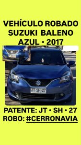 Suzuki Baleno año 2018, color gris, robado en la comuna de Maipú