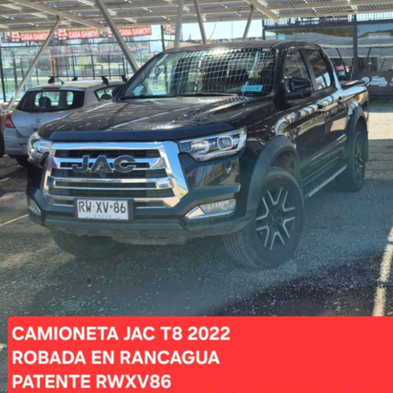 Camioneta JAC año 2022, color negro, robada en Rancagua. Vista última vez en Angostura.